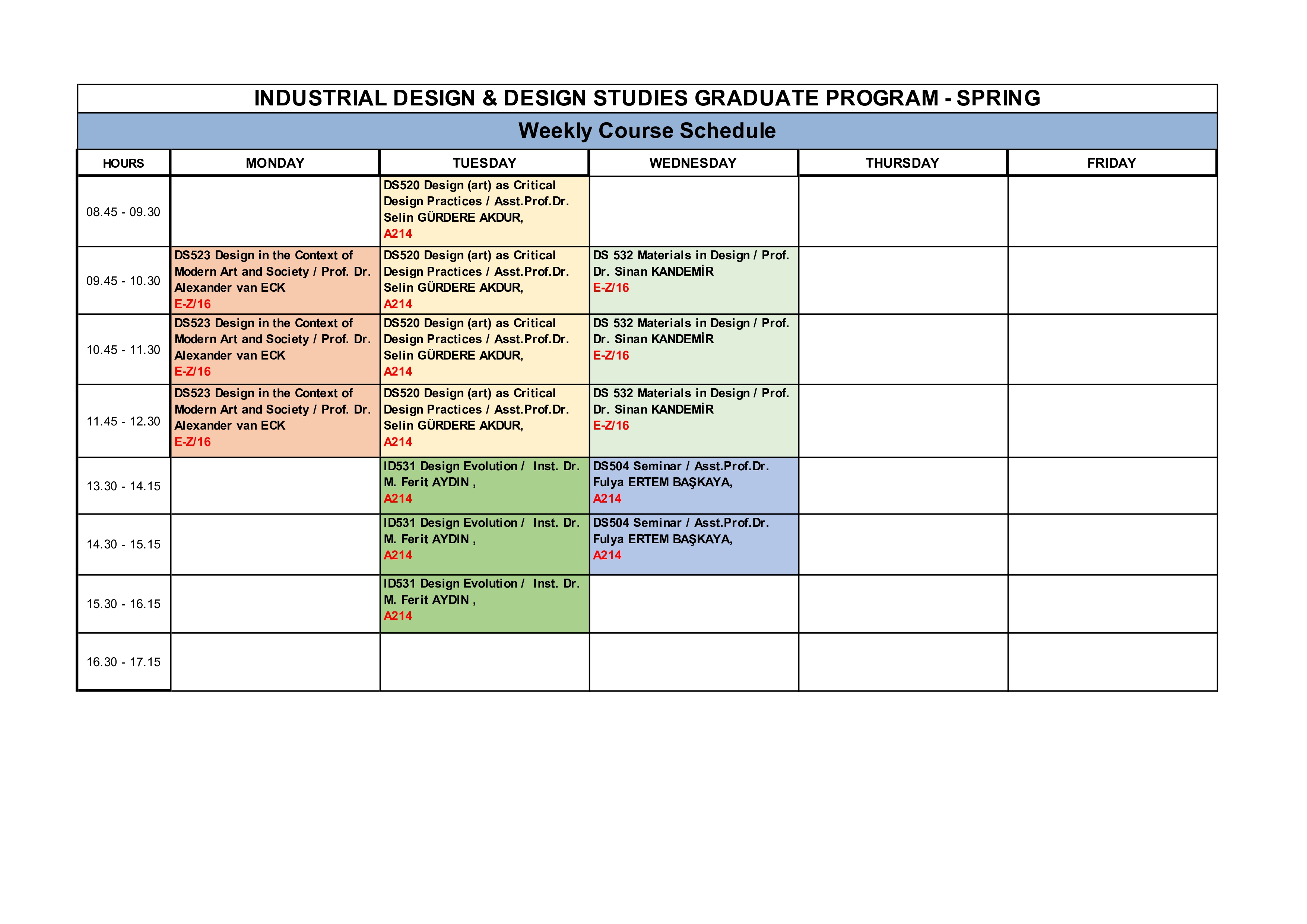 | ID521/DS502 | Tasarımda Araştırma Yöntemleri**(2-2)3 veya Etik ve Tasarımda Araştırma Yöntemleri (2-2)3 | Dr. Öğr. Üyesi Bahar Emgin Şavk | EZ16 |