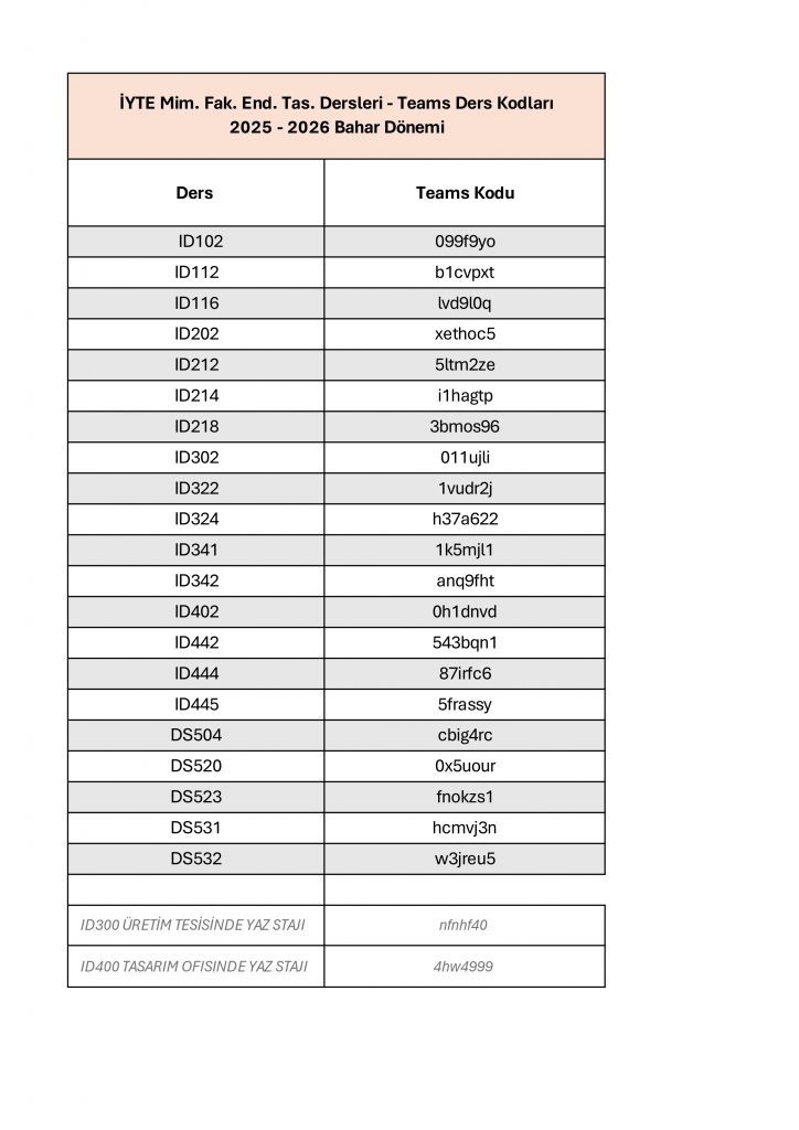 The ‘Teams’ course codes for the 2025–2026 Academic Year Spring Semester Undergraduate Industrial Design and Graduate Industrial Design & Design Studies courses have been announced.