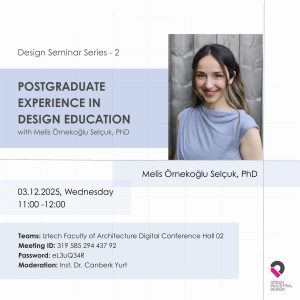 You are kindly invited to the seminar titled “Postgraduate Experience in Design Education with Melis Örnekoğlu Selçuk”, organized by the Department of Industrial Design at İzmir Institute of Technology (IZTECH) within the scope of Design Seminar Series 2. The seminar will be held online via Microsoft Teams, in the IZTECH Faculty of Architecture Digital Conference Hall 02.